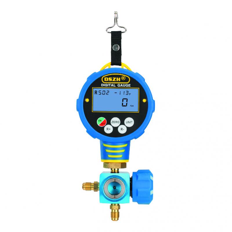 Цифровая манометрическая станция DSZH WK-6881L представляет собой одновентильный цифровой манометрический коллектор с комплектом из двух зарядных шлангов и смотровым стеклом, поставляется в металлическом кейсе. Цифровой мановакуумметр WK-688L/Н, они бывают синие (WK-688L, для низкого давления) и красные (WK-688H, для высокого), отличие: синий может и вакуум измерять и температуры кипения. В памяти у него температуры кипения по 82 хладагентам, можно изменять единицы измерения температуры (°C, °F) и давления (кПа, Бар, Psi, торр, кгс/см2, дюйм рт.ст., мм рт.ст.), можно переключать в режим вакуумметра (нажатием и удержанием клавиши "ZERO", в режиме вакуумметра не отображается хладагент и температура - только давление и показывает % от "полного" вакуума).