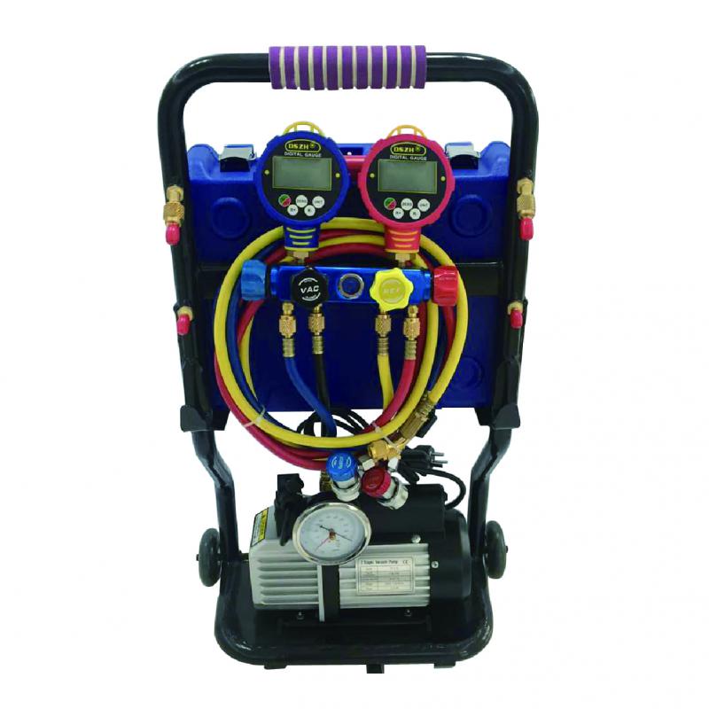 электронный манометр WK-6884, вакуумный насос WK-215SV, заправочные шланги CT-360RYB-HV(150см), быстросъемное соединение     QC-19H/L, весы RCS-7040. Фреон R134,R22,R407,R410